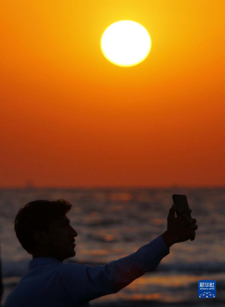 2022年12月31日,一名男子在巴基斯坦卡拉奇海边的夕阳下自拍。