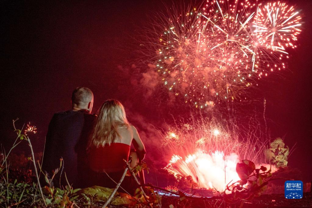 2022年12月31日,人们在印度尼西亚巴厘岛观看新年烟花。