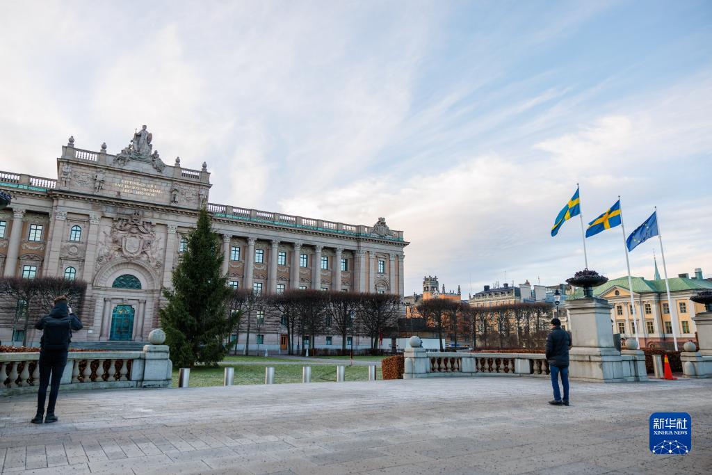 1月1日,在瑞典首都斯德哥尔摩,瑞典议会大楼外悬挂瑞典国旗和欧盟旗帜。
