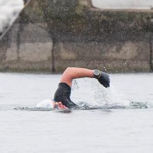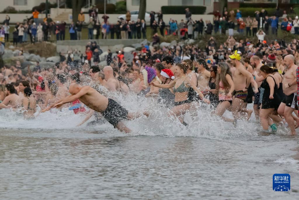1月1日,在加拿大温哥华,人们参加冬泳活动迎接新年的到来。