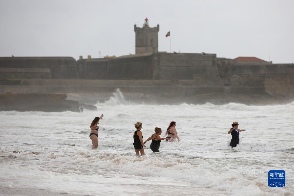 1月1日,人们在葡萄牙里斯本郊外的海滩参加传统的新年冬泳活动。