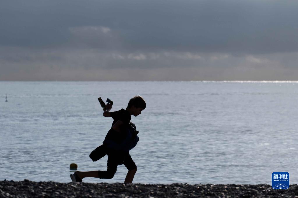 1月3日,一名儿童在法国南部城市尼斯的海边休闲。