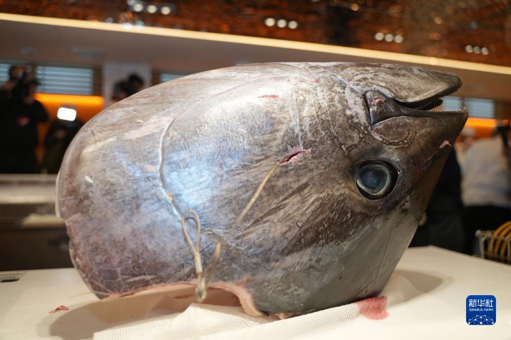 这是1月5日在日本东京表参道一家餐馆拍摄的最高价金枪鱼的鱼头。