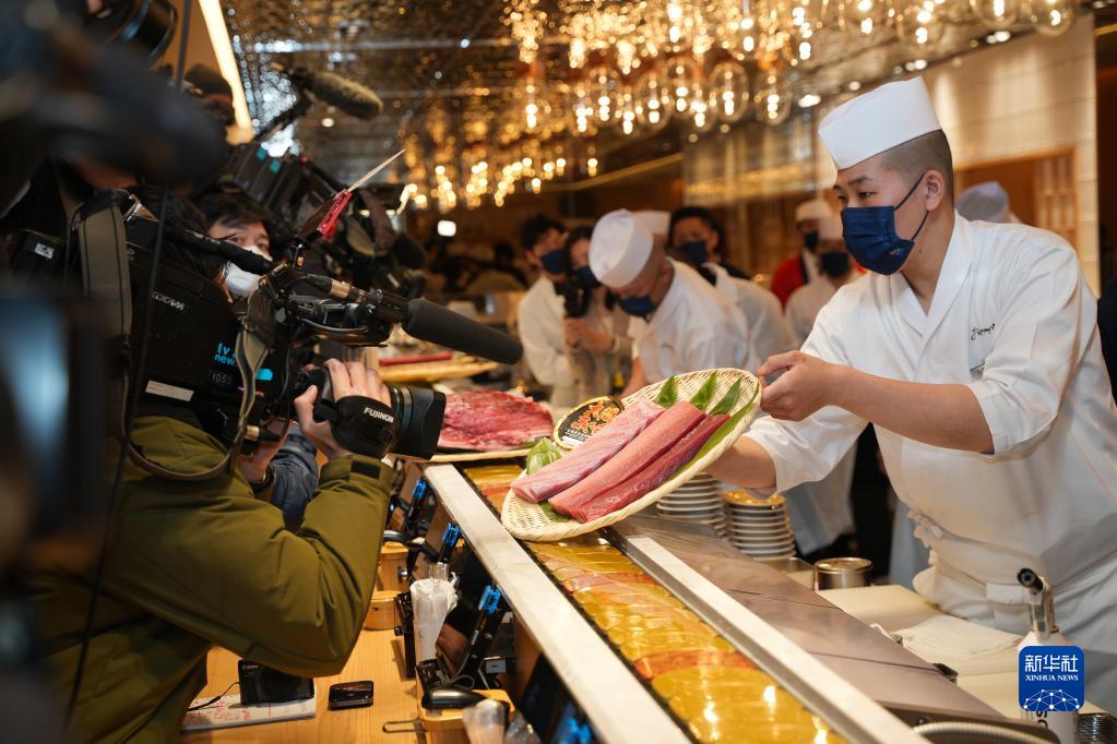 1月5日,厨师在日本东京表参道一家餐馆向媒体展示最高价金枪鱼的鱼肉。