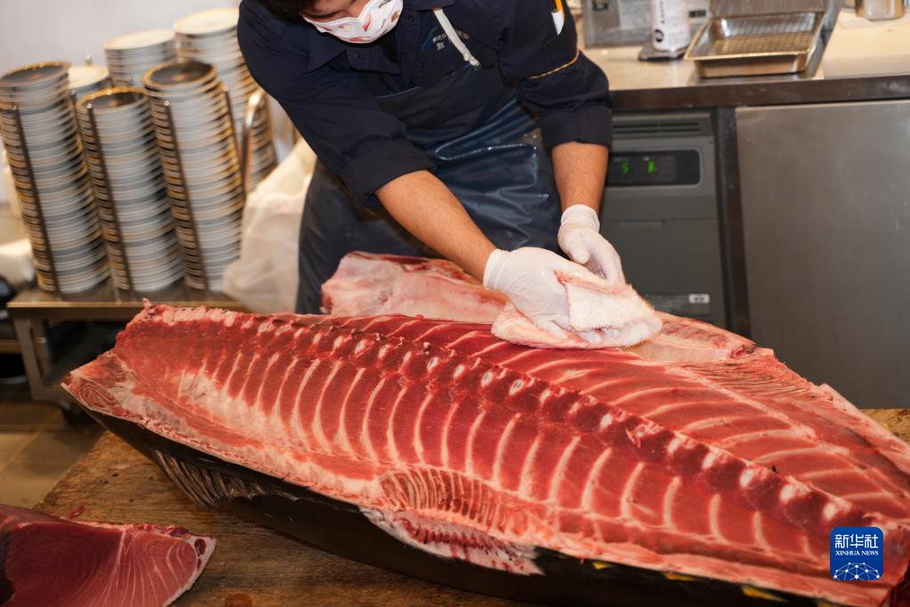 1月5日,厨师在日本东京表参道一家餐馆擦拭最高价金枪鱼的鱼肉。