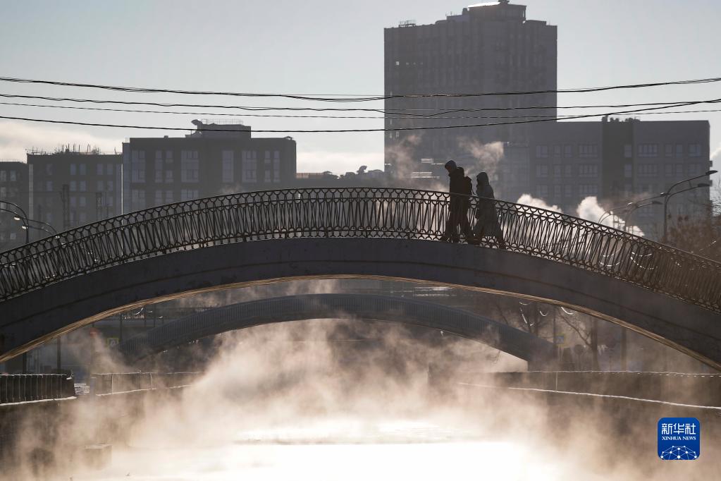 1月6日,在俄罗斯首都莫斯科,行人从桥上走过。
