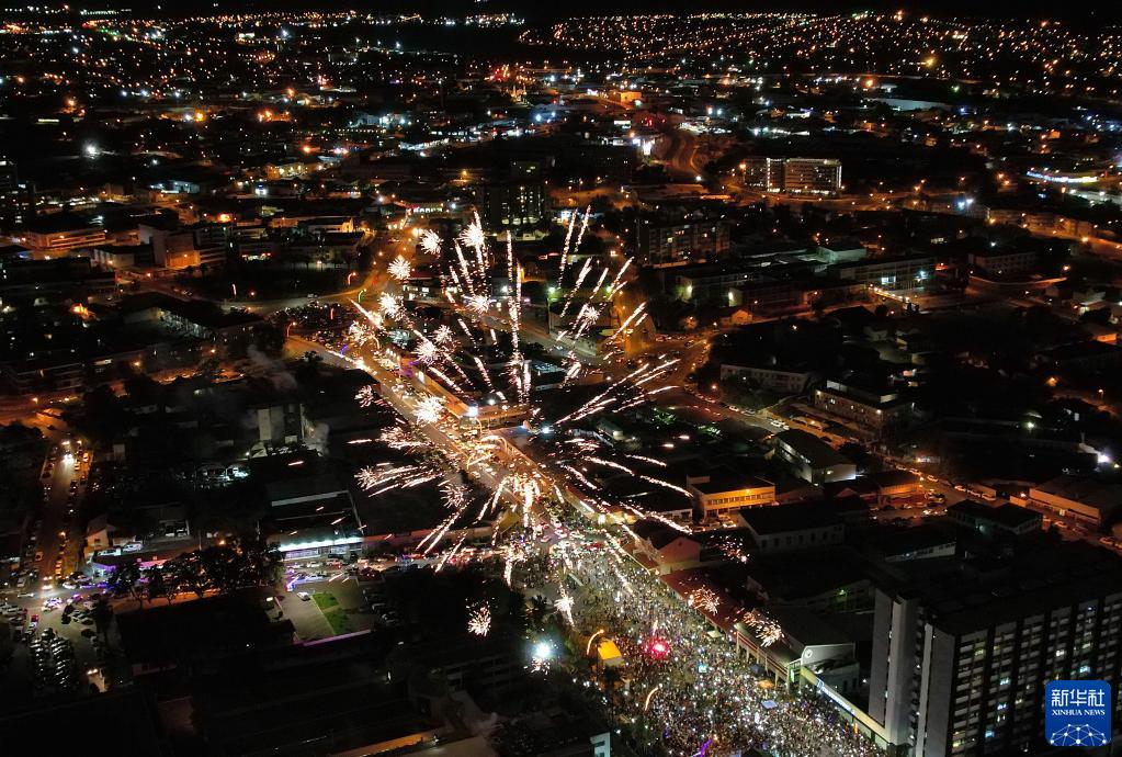 这是1月1日在纳米比亚首都温得和克拍摄的新年烟花。