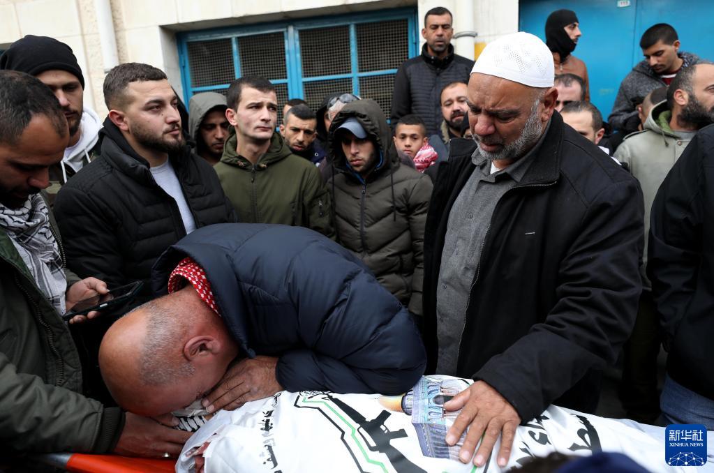 1月2日,在约旦河西岸北部城市杰宁,人们在被以色列军队打死的巴勒斯坦人遗体边哀悼。
