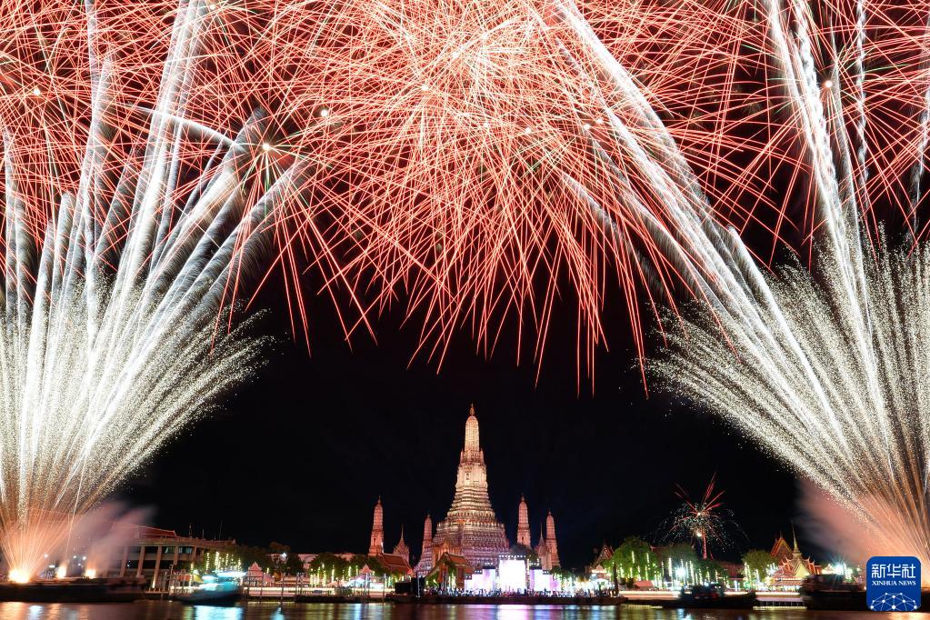 这是1月1日在泰国曼谷郑王庙上空拍摄的新年烟花。