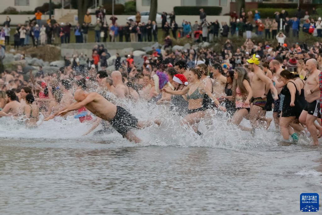 1月1日,在加拿大温哥华,人们参加冬泳活动迎接新年的到来。