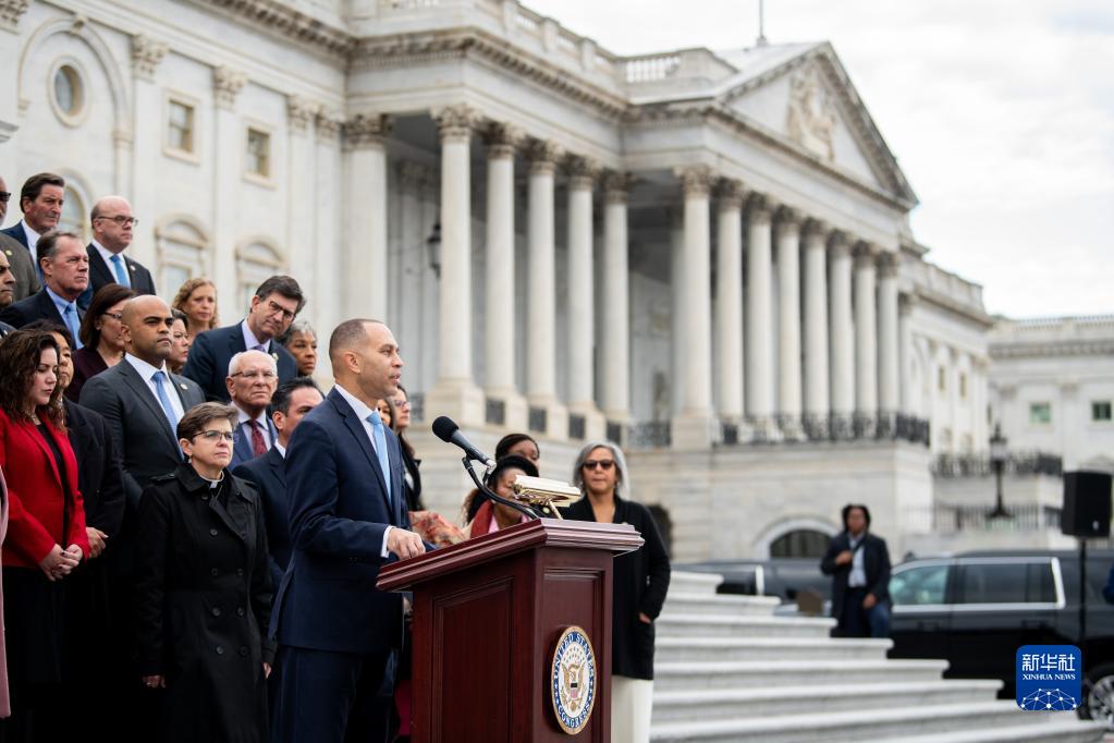1月6日,在美国首都华盛顿的国会大厦外,国会众议院成员等参加“国会山骚乱”两周年纪念仪式。
