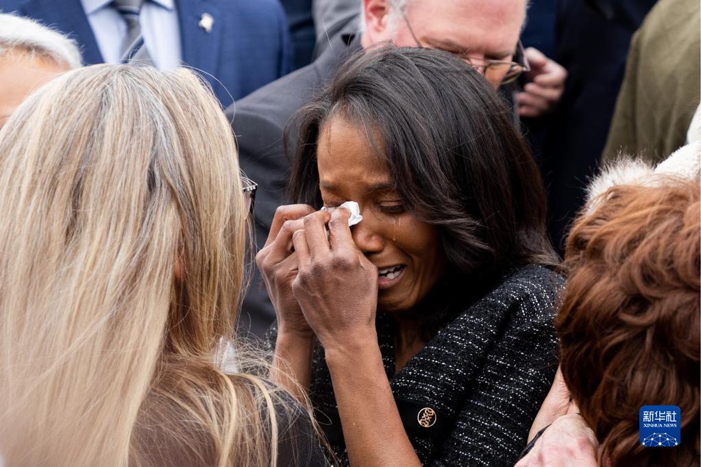 1月6日,在美国首都华盛顿的国会大厦外,一名前国会警察遗孀在纪念“国会山骚乱”两周年纪念仪式上流泪。