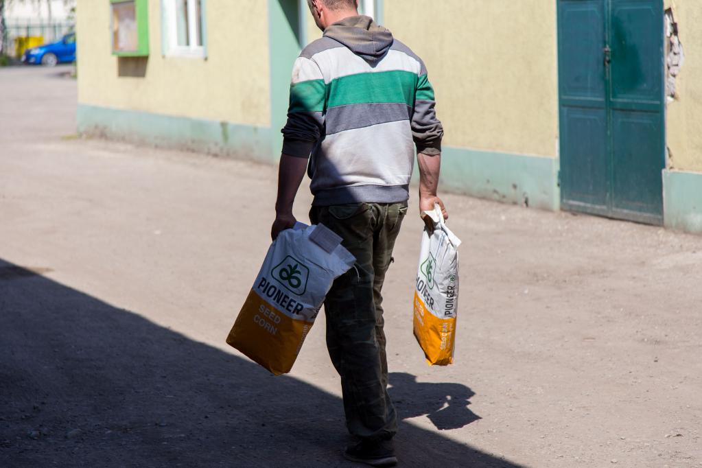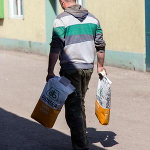 2022年4月15日,在塞尔维亚旧帕佐瓦市附近一个村庄,一名男子买走两袋种子新华社发石中玉摄