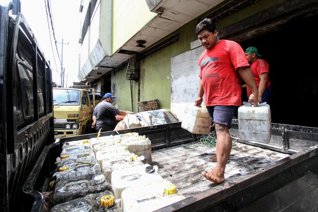 2022年4月26日,在印度尼西亚梭罗的一家传统市场,工人将装有食用油的油桶运到车辆上。新华社发(布拉姆摄)