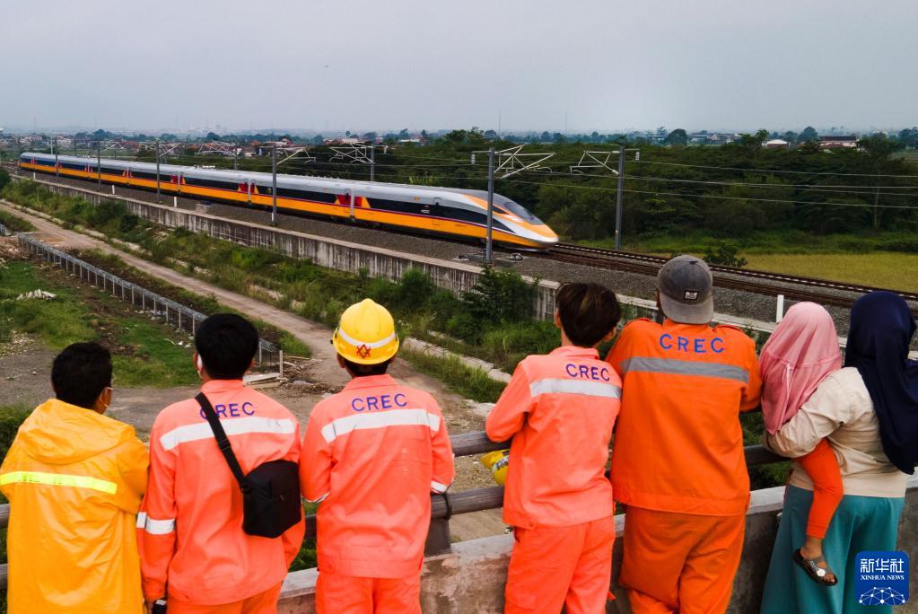 2022年11月16日,在印度尼西亚万隆,雅万高铁建设者和当地民众观看高速铁路综合检测车行驶在雅万高铁试验段(无人机照片)。高速铁路综合检测车当日对雅万高铁德卡鲁尔车站至4号梁场间线路进行了全面检测,获取的各项指标参数表现良好。