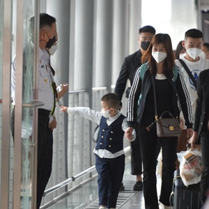 1月9日,位于泰国首都曼谷东郊沙没巴干府的素万那普机场,泰国副总理兼卫生部长阿努廷(前中)出席欢迎仪式。
