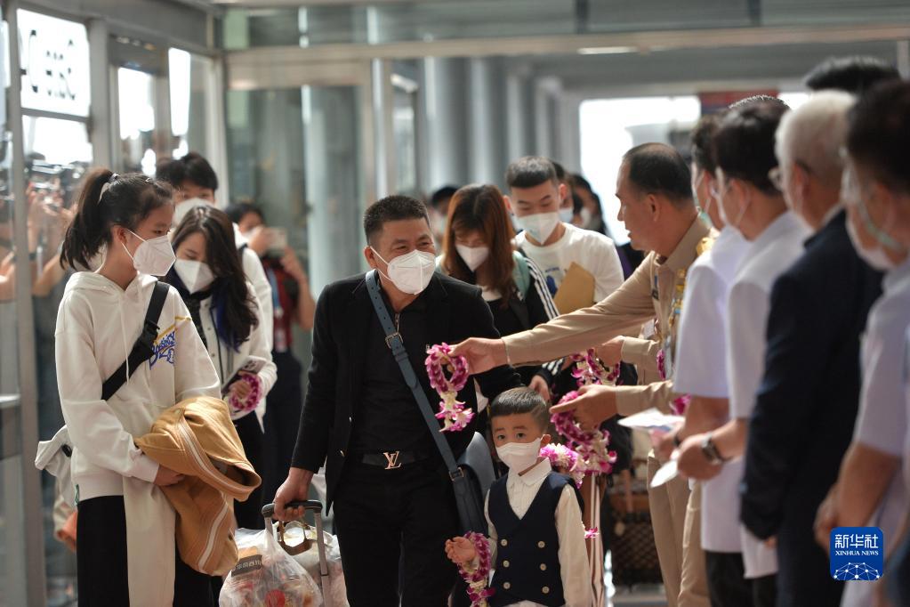 当日,泰国素万那普机场举行仪式欢迎中国出入境政策调整后首个中国赴泰国航班旅客,泰国副总理兼卫生部长阿努廷到现场迎接。该航班来自厦门,共搭载269名旅客。新华社发(拉亨摄)