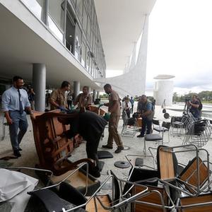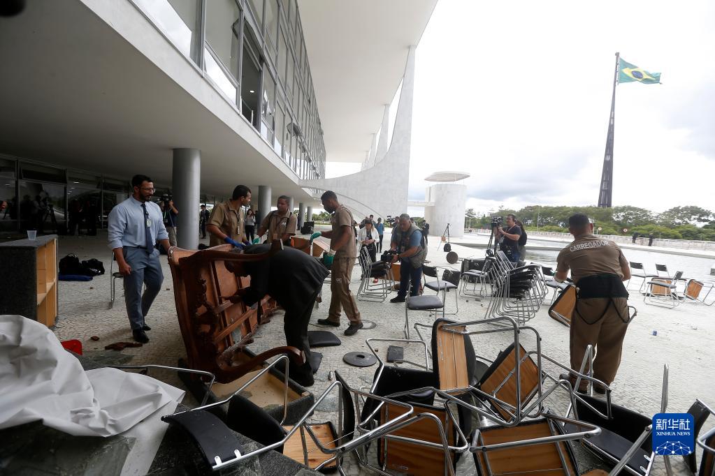 1月9日,在巴西首都巴西利亚,工作人员清理总统府普拉纳尔托宫遭到破坏的家具。