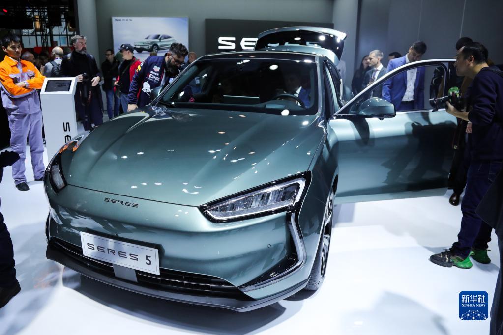 1月13日,人们在比利时布鲁塞尔车展媒体开放日上参观赛力斯5电动汽车。