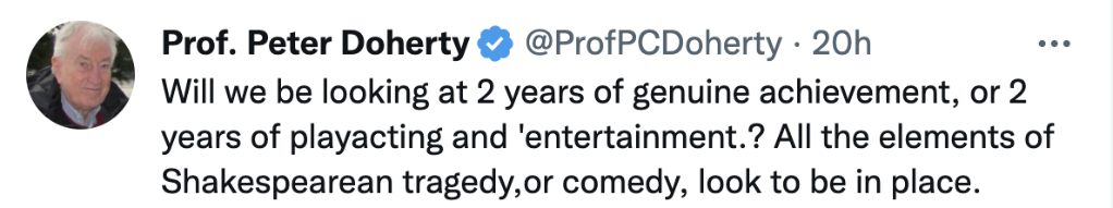 展望美国新国会未来两年形势,澳大利亚免疫学专家、诺贝尔奖得主彼得·多尔蒂讽刺道:“我们将看到出成绩的两年,还是装腔作势娱乐大众的两年?莎士比亚悲剧或喜剧所有元素看起来都已到位。”