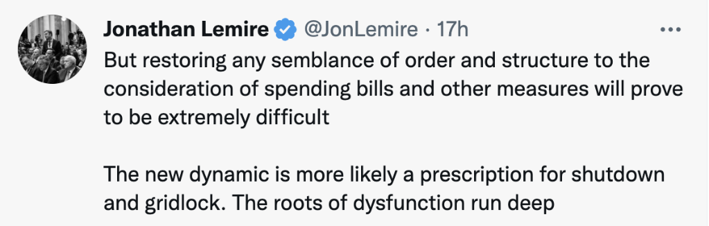 美国《政治报》白宫首席记者乔纳森·莱迈尔点评说,推进相关立法工作将变得“极为困难”,恐将催生政府停摆和僵局,“失能根深蒂固”。
