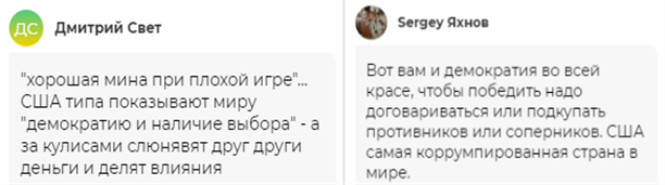 俄罗斯网友德米特里评价说,美国向全世界标榜所谓“自由与选择”,但在幕后搞金钱交易并划分势力范围。另一名网友谢尔盖说,“这就是你们所谓的民主,为了赢得胜利,必须向对手妥协或贿赂对方。美国是世界上最腐败的国家”。
