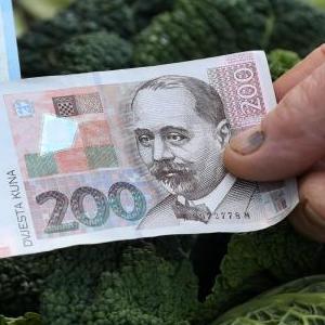 这是1月14日在克罗地亚希贝尼克一处果蔬摊拍摄的库纳(右)和欧元纸币。新华社发(Pixsell图片社/杜什科·亚拉马兹摄)