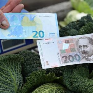 这是1月14日在克罗地亚希贝尼克一处果蔬摊拍摄的库纳(右)和欧元纸币。