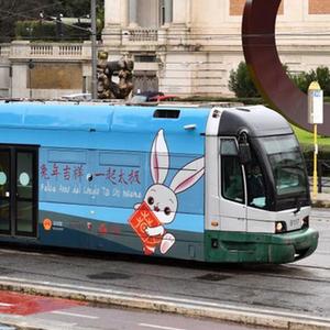 当日,兔年春节主题电车亮相意大利首都罗马,庆祝即将到来的中国农历新年。