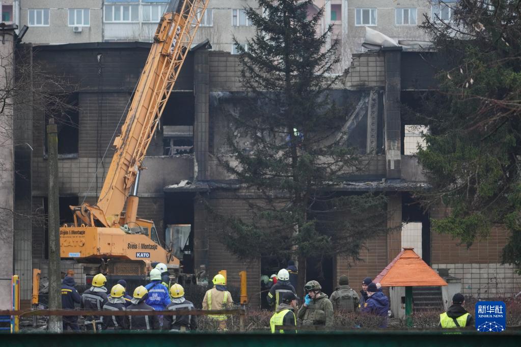 1月18日,乌克兰国家紧急情况局工作人员在乌克兰基辅市东郊布罗瓦雷的直升机坠机现场工作。