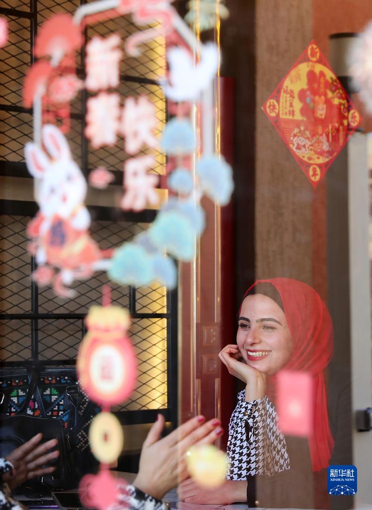 1月18日,一位顾客在位于埃及首都开罗的一家烘焙坊内感受中国春节氛围。临近中国农历春节,这家烘焙坊推出兔年春节主题装饰与商品,增添节日气氛、吸引消费者。