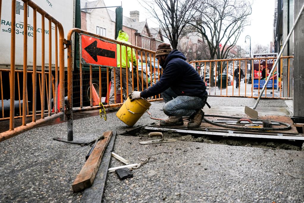 一名工人在美国纽约修理人行道地面。(新华社发,朱子于摄)