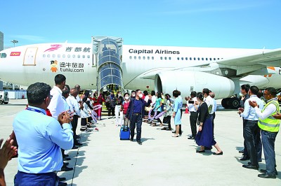 1月18日,乘坐中国首都航空JD455航班的游客在马尔代夫马累维拉纳国际机场受到热烈欢迎。新华社发