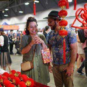 1月21日,在新西兰奥克兰举行的迎接中国农历春节活动上,人们购买新春装饰品。