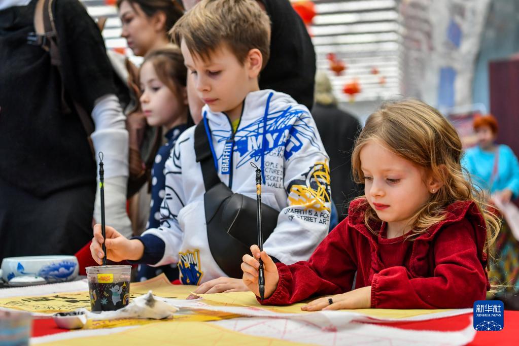1月21日,儿童在俄罗斯莫斯科的迎新春活动上学习书法。