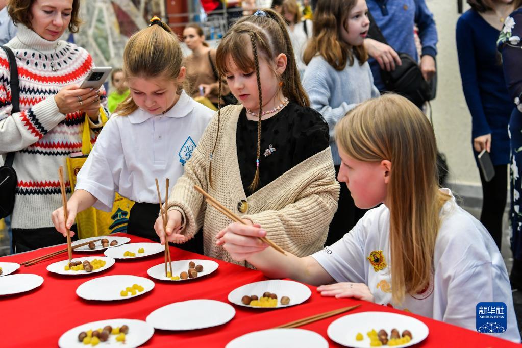 1月21日,儿童在俄罗斯莫斯科的迎新春活动上学习使用筷子。