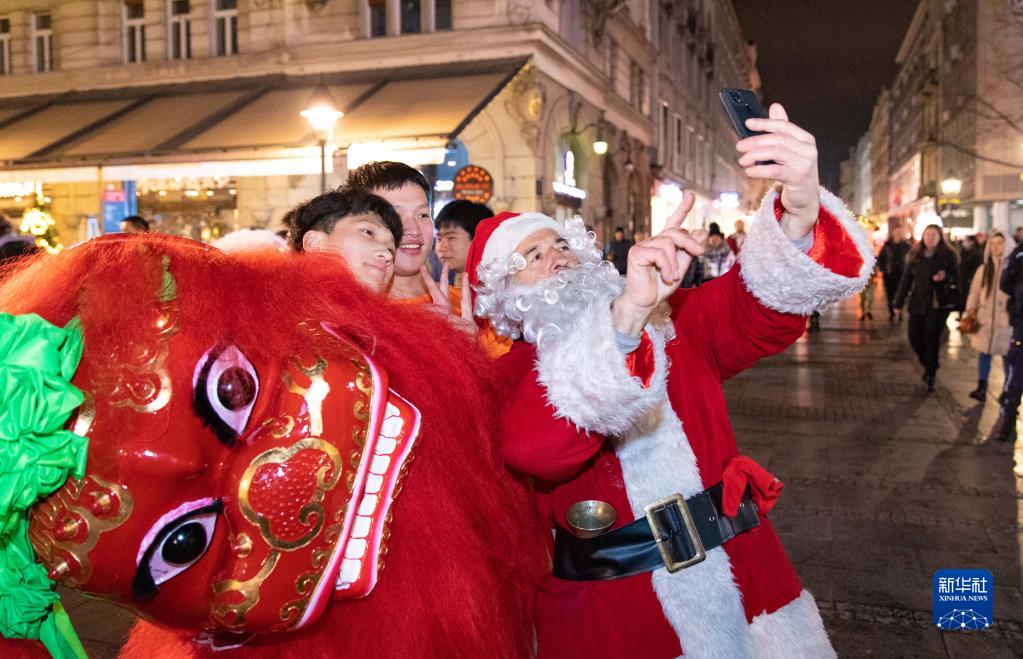 1月21日晚,在塞尔维亚首都贝尔格莱德举行的“欢乐春节——丝绸之路上的友谊大篷车”活动上,当地一名圣诞老人装扮者与舞狮表演者合影。