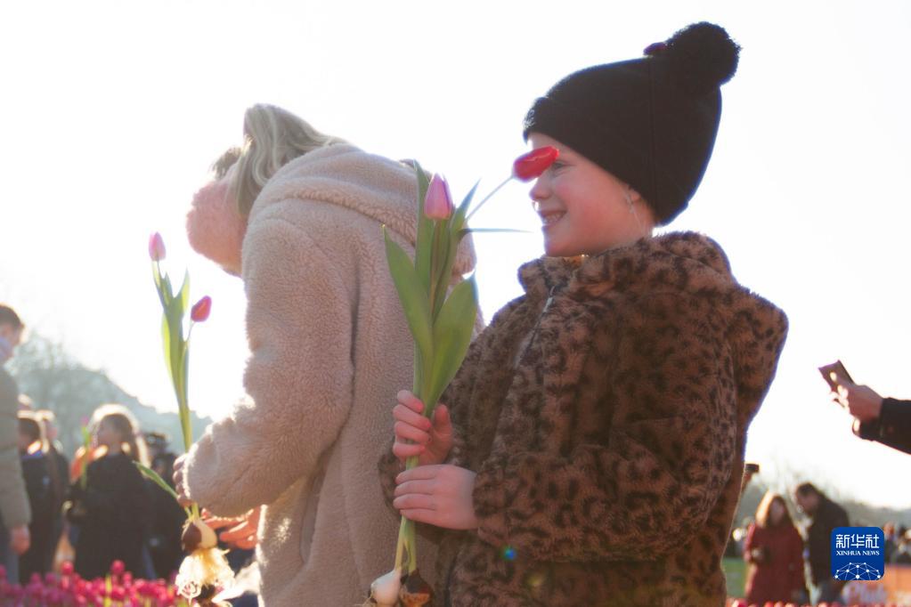 1月21日,一名儿童在荷兰阿姆斯特丹的皇家博物馆前采摘郁金香。