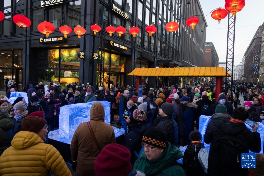赫尔辛基的中国新年庆祝活动21日在市中心举行。串串火红的灯笼将街道装饰一新,以兔子为主题元素的冰雕展和舞狮等传统民俗表演吸引了大批民众。