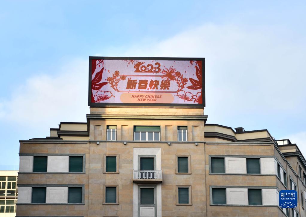 1月21日,意大利米兰圣巴比拉广场建筑上方的大屏幕循环播放兔年春节动画。