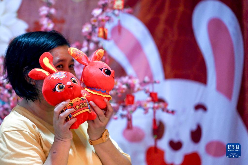 1月21日,观众在印度尼西亚万丹参加春节庆祝活动时手举兔子玩偶。
