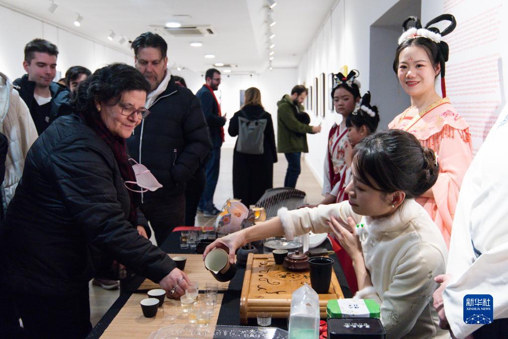 1月20日,西班牙马德里当地民众在春节庆祝活动中品茶。