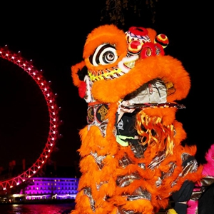 1月13日,在英国伦敦,演员在亮起红色灯光的“伦敦眼”前表演舞狮。当晚,英国伦敦地标建筑、巨型摩天轮“伦敦眼”亮起红色灯光,迎接中国农历新年的到来。新华社记者李颖摄