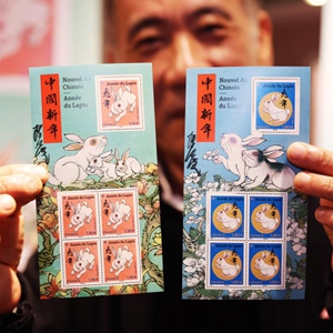 法国发行的兔年生肖邮票共两款,由法国华人艺术家陈江洪设计。一款票面是粉红色背景衬托着俯卧的白兔,另一款票面是蓝色背景上一轮满月衬托着站立起来的玉兔。