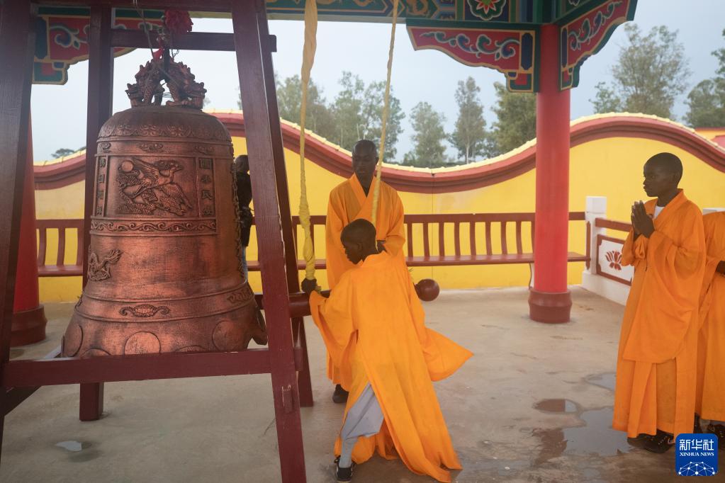 1月21日,在位于赞比亚首都卢萨卡市郊区的少林寺文化中心,学员撞钟祈福。新华社记者 彭立军 摄
