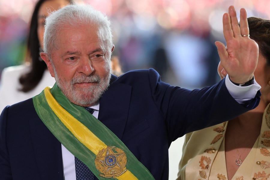 1月1日,在巴西首都巴西利亚,巴西总统卢拉在总统府“高原宫”参加就职仪式。(新华社记者王天聪摄)
