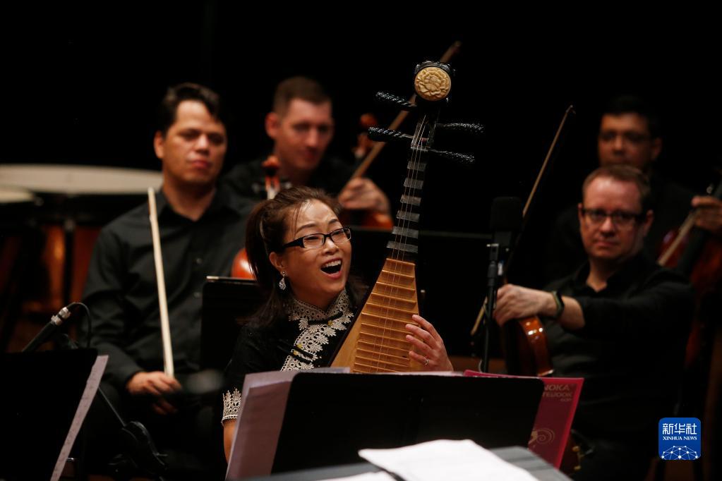 1月21日晚,在巴西首都巴西利亚普利尼奥·马科斯剧院,中国民乐演奏家与巴西利亚室内乐团的音乐家们在2023年“欢乐春节”音乐会上演奏乐曲。