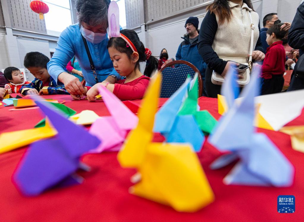 1月22日,在加拿大多伦多,一名女孩与奶奶在春节“庙会”上学习折纸。