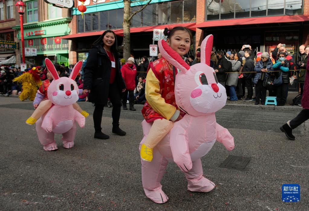 1月22日,在加拿大温哥华,人们扮成兔子参加大巡游。