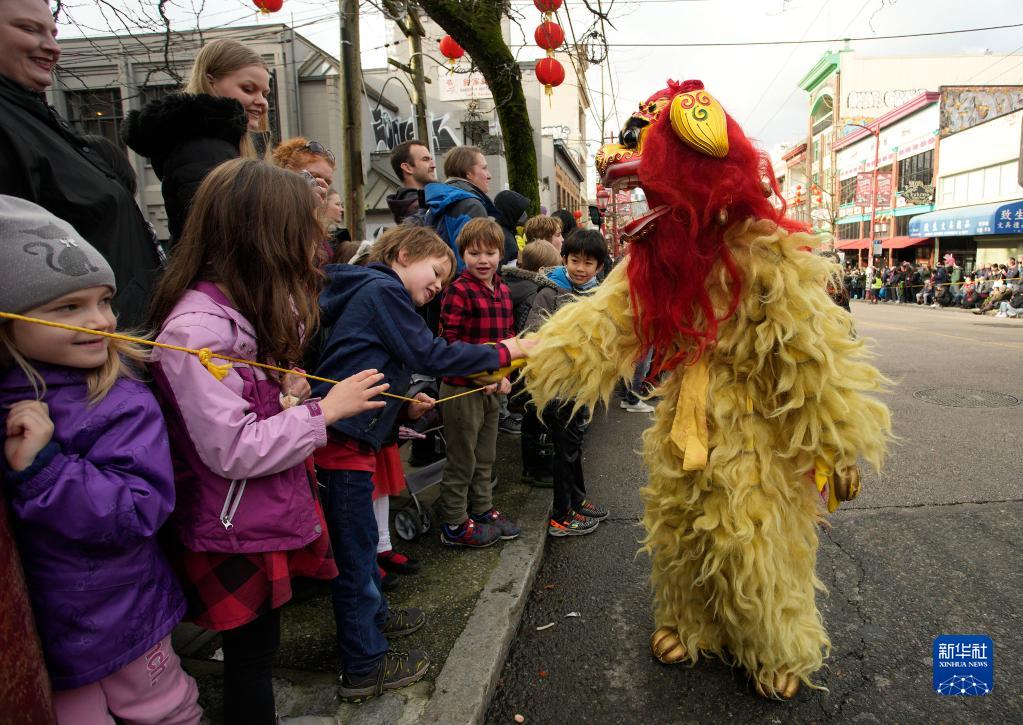 1月22日,在加拿大温哥华,扮成狮子的表演者与儿童互动。